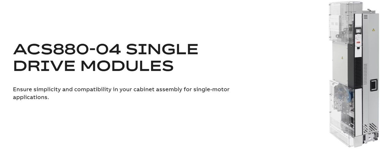 Đây là loại module biến tần dành cho một động cơ, tối ưu để tích hợp vào tủ điều khiển riêng của khách hàng. Module ACS880-04 (loại biến tần đơn) có thiết kế nhỏ gọn với cấp bảo vệ IP20, giúp lắp đặt an toàn, chất lượng cao và tiết kiệm không gian, chi phí. Đối với ứng dụng công suất lớn, có thể đấu hai module song song để đạt công suất tới ~2200 kW. Biến tần ACS880 dạng đơn phù hợp cho các máy móc độc lập, ví dụ bơm, quạt, máy nén, băng tải, máy trộn, máy nghiền,… nơi mỗi động cơ được điều khiển bởi một biến tần riêng biệt.