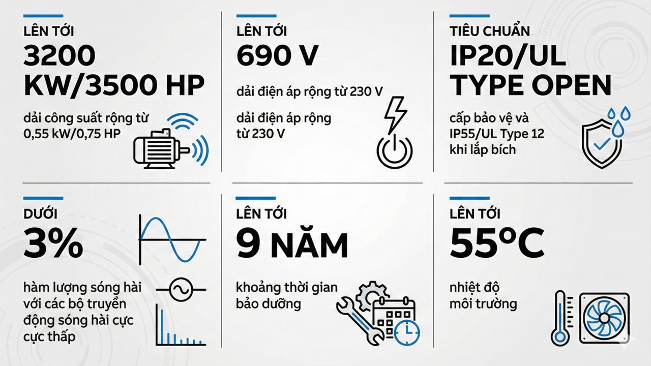 Dải công suất 0,55 – 3200 kW (0,75 – 3500 HP)