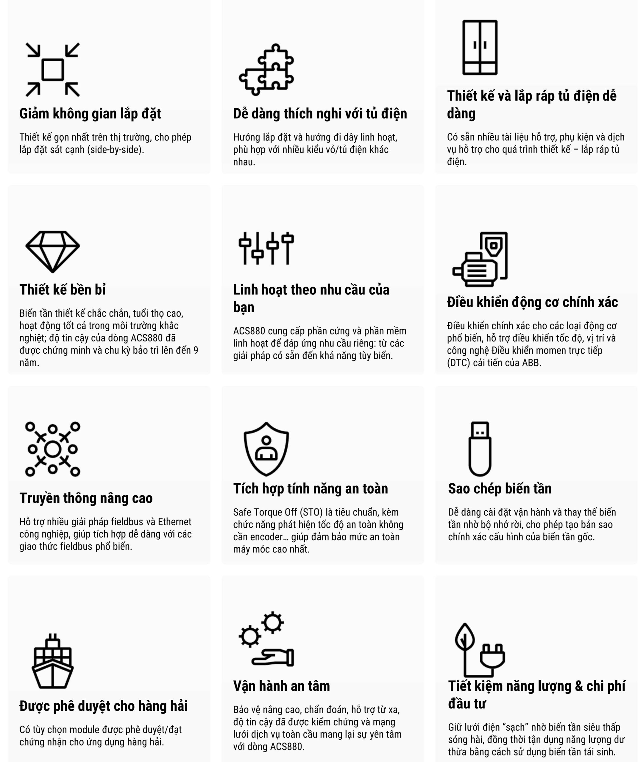 Dòng biến tần ACS880 drive modules thuộc phân khúc biến tần công nghiệp hạ áp “all-compatible” của ABB, với dải công suất rộng từ 0,55 kW đến 3200 kW. Nhờ khả năng tương thích linh hoạt, ACS880 có thể đáp ứng đa dạng ứng dụng từ quy mô nhỏ đến lớn. ACS880 được thiết kế tối ưu để lắp đặt trong tủ điện của khách hàng, tích hợp dễ dàng với hệ thống hiện hữu. Dòng biến tần này bao gồm các mô-đun đơn (điều khiển một động cơ) và mô-đun đa (hệ multidrive cho nhiều động cơ).